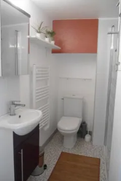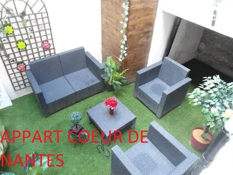 3-kamer appartement ”Jardin en Ville”, voor 6 personen, 47 m2, op de bovenverdieping, comfortabel en modern ingericht. Woon-/eetkamer met Sat-TV en eettafel. Roken niet toegelaten. Internet (WIFI). 1 2-pers divanbed. Slaapkamer met 1 dubbel bed. Slaapkamer met 1 dubbel bed. Open keuken met 2 kookplaten, magnetron en koelkast. Douche/WC. Zithoek in de tuin 18 m2, terrasmeubelen. Overige voorzieningen: kinderstoel, haardroger, strijkijzer, wasmachine, droger. 44109000410C1