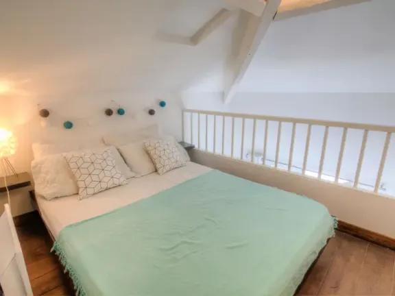 Maisonette 3-kamers 53 m2 op de 3e verdieping, op het zuiden gelegen. Gedeeltelijk afgeschuinde daken, eenvoudig en doelmatig ingericht: woon-/eetkamer met eettafel en TV (Flatscreen TV). Uitgang naar het balkon. Open keuken (afwasmachine, 3 keramische glas kookplaten, broodrooster, waterkoker, magnetron, diepvriezer, elektrische koffiemachine, pads voor de koffiemachine (Nespresso) extra). Uitgang naar het balkon. Douche/WC. Verwarming, air-conditioning. Zolderverdieping: 2 kamers met afgeschuinde daken, elke kamer heeft 1 2-pers bed (140 cm, lengte 190 cm). Aparte WC. Klein balkon, op het zuiden gelegen. Panoramazicht op zee. Ter beschikking: wasmachine, strijkijzer, haardroger. Internet (Internet (WiFi), extra). Let op: geen lift. 06088003832JQ